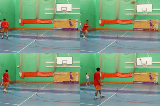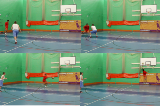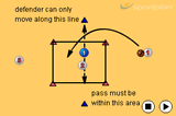 When players reach the halfway line, player with the ball places ball on the ground and becomes the defender.