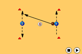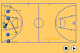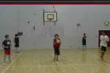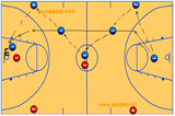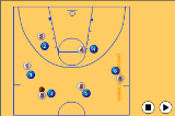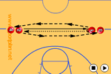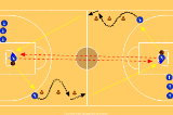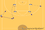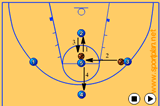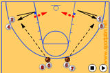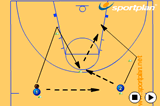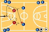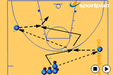 player at the top passes the ball in either direction then sets the screen the opposite way. in the diagram 1 passes to 3 and sets a screen for player 2. 2 curls round towards the basket and receives a pass from player 3 to shoot a lay-up. collects the lay up and passes to either player and sets the a screen.
