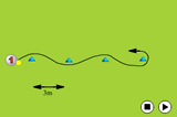 The player starts with a ball from the left cone, runs to the second cone and hits the ball on the move towards the target.