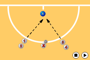 One shooter from each side runs out and into the circle. X passes the ball to the free shooter who balances then shoots.