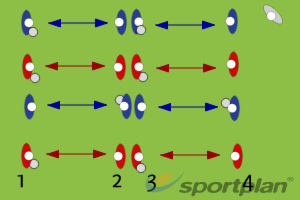 Players in the middle (players 2 and 3) stand back to back and opposite their partners (players 1 and 4), about 5 metres apart, but they gradually move further away up to a distance of 9 metres (this is distance from bowler to batter).