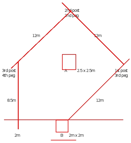 - Directly opposite peg 1 put another peg (peg 2) at a distance of 17m. This will be 2nd post