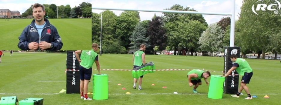 Skills Focus: Rucking, Jackling, Technique, Contact Conditioning Overview: Players start face down on the ground next to two sausage pads with a ball wedged in the middle. On the whistle they jump up into a strong and safe jackle position to compete for the ball. Key Improvement: Improve the ability to bounce off the ground and compete for the ball. |