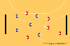Setup:Divide players into two teams: Team A (runners) and Team B (throwers). Team B stands inside gymnastics hoops spread across the playing area. Each player has their own hoop and cannot leave it. Only one player from Team A runs in the playing area at a time. Objective:Team B: By passing the ball among themselves, they try to hit (tag) the active runner from Team A. Team A: Players take turns running to avoid being hit. The goal is to survive as long as possible. Rules:Team B must stay inside their hoops while passing and throwing the ball. A designated free player from Team B (not in a hoop) retrieves the ball after missed throws and passes it back to teammates in the hoops. Team A sends in one runner at a time. If the runner is hit, they are out and perform a designated exercise (e.g., lunges, push-ups, wall passes, dribbling through a course, etc.). The game continues until all runners from Team A have been hit. Track how long it takes to eliminate all runners. Ways to Make It More Challenging:Hoop Placement: Increase or decrease the distances between hoops to make passing easier or harder. Field Size: Adjust the size of the playing area to create more or less space for the runner to avoid being hit. Movement Restrictions: Runners can only move in specific ways, such as crawling, sliding, or hopping. Thrower Mobility: Allow players in hoops to step out, pass among themselves, and tag the runner directly with the ball. Variations:Defense for Runners: Each runner can hold a ball to deflect incoming throws. Cooperative Defense: Allow multiple runners to be active at once, working together to dodge and defend.