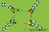 Set up a square of cones, and get the players to form equal lines behind each cone. The ball starts in the hands of a player behind cone 1, who runs (black running line) towards cone 2, passes the ball to the player behind cone 2 who passes the ball back to the first player. The first player then runs towards cone 3 and passes the ball to the player standing behind cone 3. The player who passed the ball from behind cone 2 runs (blue running line) following the run of the first player and receives a pass from the player behind cone 3 before running towards cone 4 and passing the ball to the player behind cone 4. The player who passed the ball from behind cone 3 runs (yellow running line) following the run of the second player and receives a pass from the player behind cone 4 before running towards cone 1 and passing the ball to the player behind cone 1. The player who passed the ball from behind cone 4 runs (red running line) following the run and receives a pass from the player behind cone 1 before running towards cone 2 and passing the ball to the player behind cone 2. The player who passed the ball from behind cone 1 runs (black running line) following the run and receives a pass from the player behind cone 2 before running towards cone 3 and passing the ball to the player behind cone 3, and the drill continues. Change the direction which the ball is going. Progressions: Get the players to change direction on your command (shout/whistle etc) Multiple balls As a group must complete 10 successful passes before the session can move on, every time a ball is dropped the whole group does an exercise (e.g. 10 press ups).