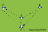 Set up a square of cones, and get the players to form equal lines behind each cone.The ball starts in the hands of a player behind cone 1, who runs (black running line) towards cone 2, passes the ball to the player behind cone 2 who passes the ball back to the first player. The first player then runs towards cone 3 and passes the ball to the player standing behind cone 3.The player who passed the ball from behind cone 2 runs (blue running line) following the run of the first player and receives a pass from the player behind cone 3 before running towards cone 4 and passing the ball to the player behind cone 4.The player who passed the ball from behind cone 3 runs (yellow running line) following the run of the second player and receives a pass from the player behind cone 4 before running towards cone 1 and passing the ball to the player behind cone 1.The player who passed the ball from behind cone 4 runs (red running line) following the run and receives a pass from the player behind cone 1 before running towards cone 2 and passing the ball to the player behind cone 2. The player who passed the ball from behind cone 1 runs (black running line) following the run and receives a pass from the player behind cone 2 before running towards cone 3 and passing the ball to the player behind cone 3, and the drill continues.Change the direction which the ball is going.Progressions:Get the players to change direction on your command (shout/whistle etc)Multiple ballsAs a group must complete 10 successful passes before the session can move on, every time a ball is dropped the whole group does an exercise (e.g. 10 press ups).